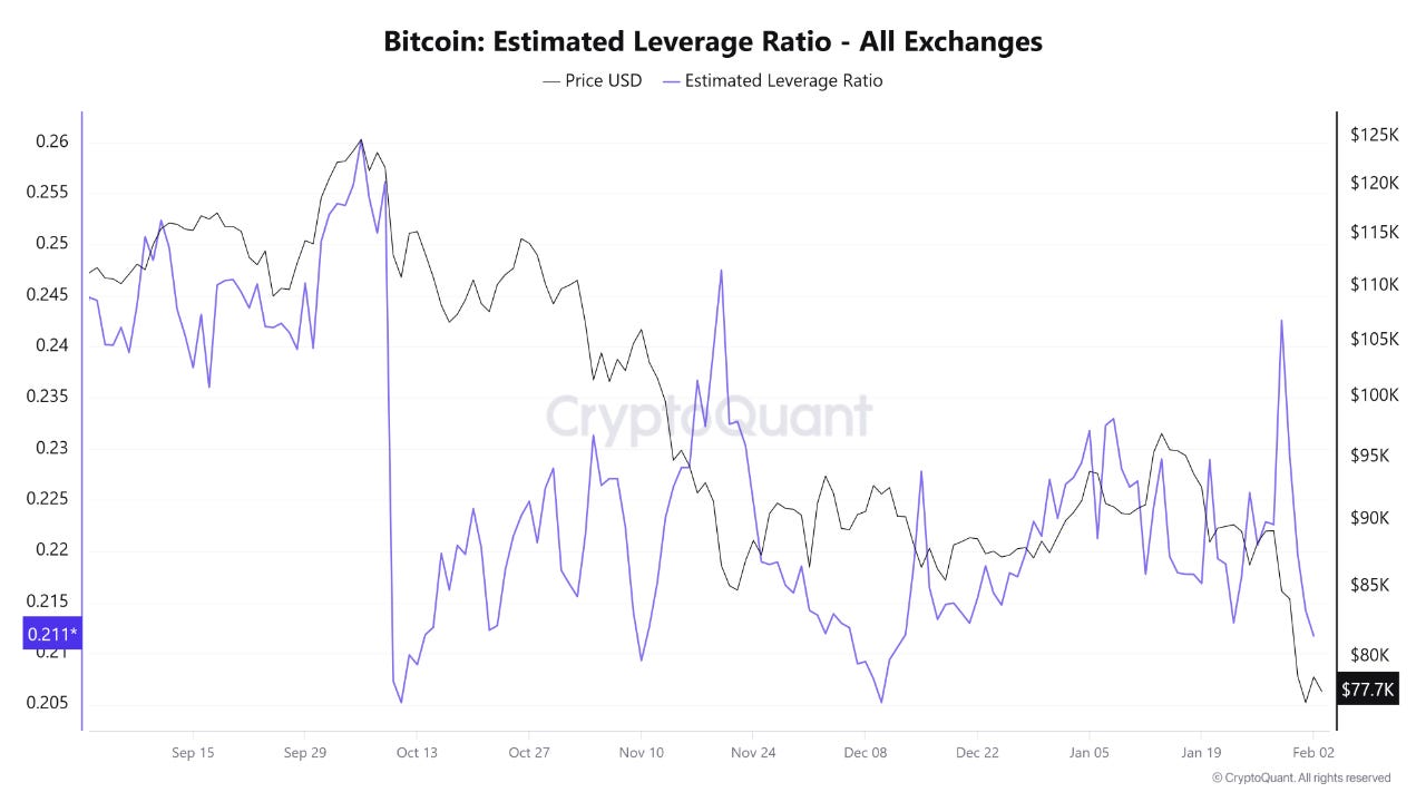 近期 BTC 市場「估計槓桿率」(Estimated Leverage Ratio)的數據顯示,BTC 投資者的行為出現了明顯轉變,全網平台的數據指出,槓桿率已降至約 0.21,創下自 12 月中旬(當時交易水平相對較高)以來的最低紀錄,這一跌幅反映出投資者對槓桿倉位的依賴程度有所下降,也顯示出大部分交易者的風險偏好正在減弱。