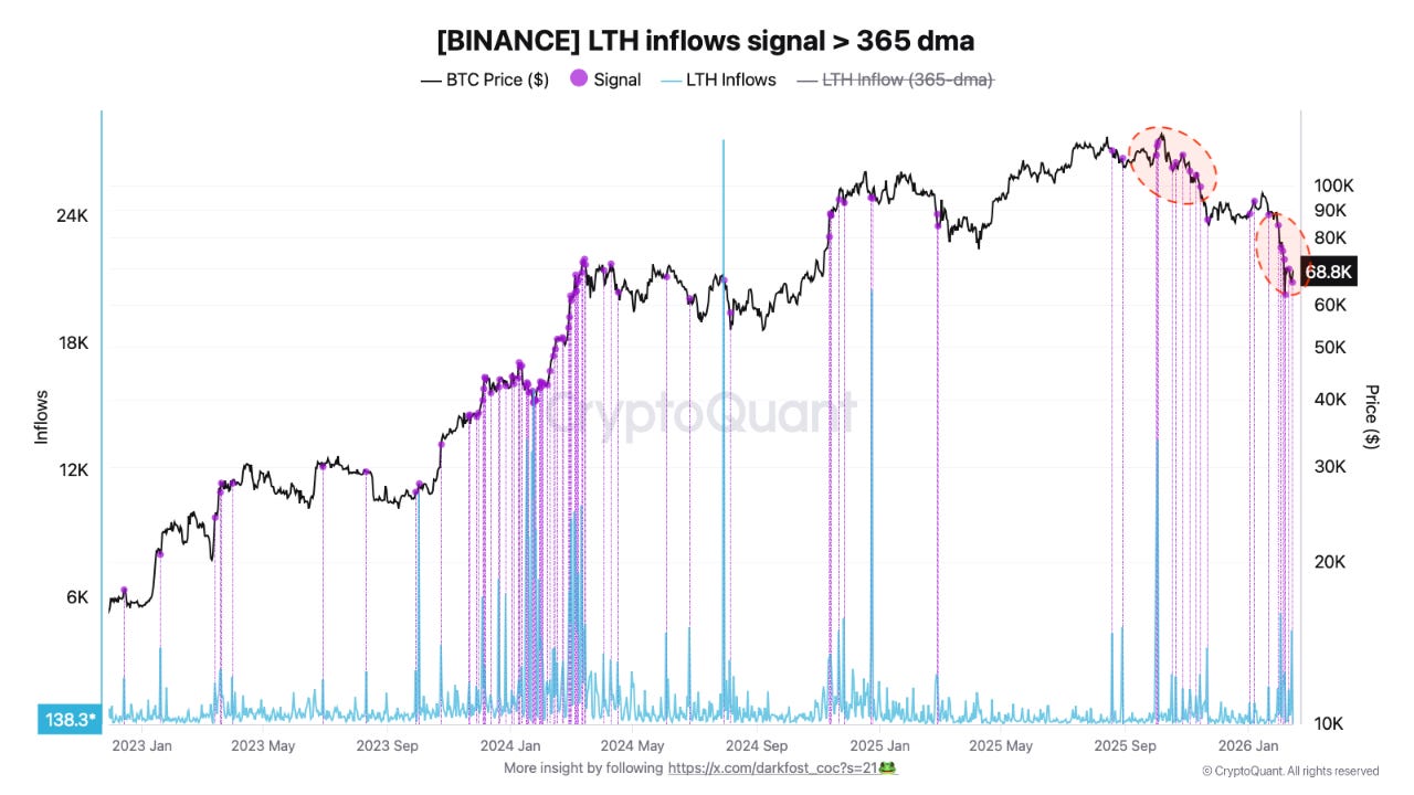 平均而言,這意味著長期持有者目前的賣出行為是以虧損出場,反映出這群歷來韌性極強的投資者群體中,財務壓力正逐漸累積。與此同時,儘管實現虧損的比例不斷增加,長期持有者在最近幾週向幣安的入金量卻有所增加。