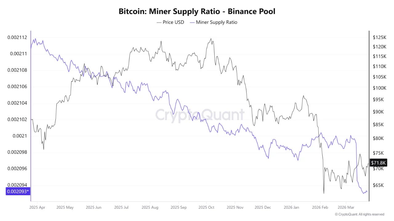 自 2025 年初以來,CryptoQuant 的礦工供應比率(Miner Supply Ratio)持續下降,顯示礦工發送到幣安的 BTC 數量正在減少,儘管如此,BTC 價格卻呈現先升後跌的走勢。這表明即便礦工賣壓減輕,價格仍有可能下跌。