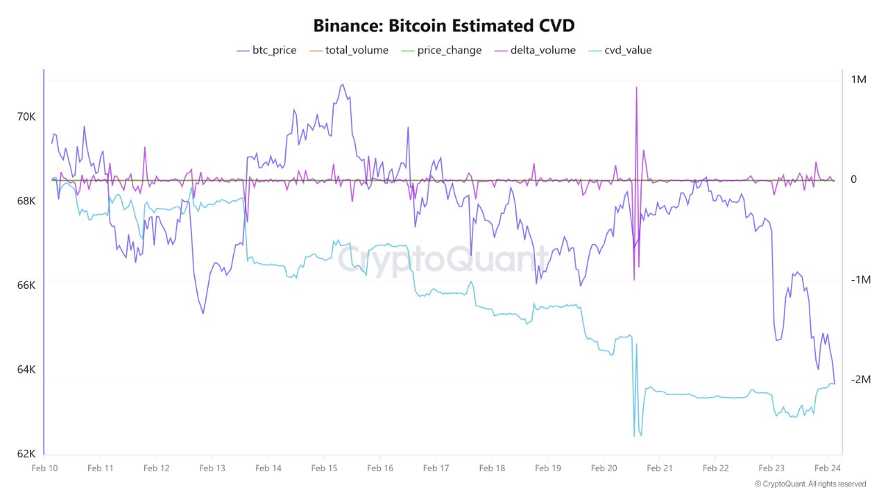 儘管短期前景偏向看空,但若 CVD 持續下降卻未進一步加速,則可能暗示賣壓正逐漸減弱,反之如果 CVD 持續下降,比特幣恐將向下挑戰 6 萬美元。如果價格能穩定在 62,000 美元至 64,000 美元的區間上方,且 CVD 開始回升或轉為橫向盤整,這可能是需求回升以及新一輪吸籌階段開始的早期訊號。