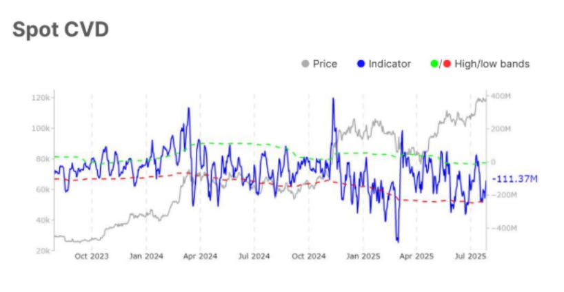 現貨市場的累積交易量差額(Spot CVD)出現顯著改善,顯示在價格下跌後,已有買家進場承接,形成短期支撐力量,但整體現貨市場動能卻漸漸衰竭,相對強弱指數(RSI)從 74.4 的超買區間大幅回落至 51.7,顯示買方動能已顯著疲乏,現貨交易量萎縮至 86 億美元,市場整體參與度下降。